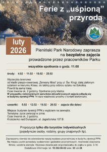 Pieniński Park Narodowy zaprasza na wyjątkowy cykl bezpłatnych zajęć edukacyjno-przyrodniczych w ramach ferii zimowych 2026. Pod hasłem „Ferie z uśpioną przyrodą” pracownicy Parku przygotowali propozycje zarówno dla dorosłych, jak i dla dzieci, które pozwolą odkryć tajemnice zimowej przyrody Pienin.