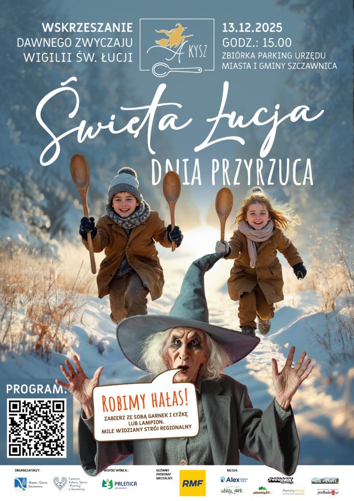 13 grudnia Szczawnica zamieni się w rozświetlone, pełne energii miasto, w którym dawna pienińska tradycja powróci w wielkim stylu! W noc świętej Łucji górale wychodzili z domów z garnkami, łyżkami i lampami, by wspólnym hałasem, światłem i śpiewem przegonić złe moce oraz powitać to, co dobre, jasne i nowe. Dziś pragniemy przypomnieć ten niezwykły zwyczaj i nadać mu nowe życie.