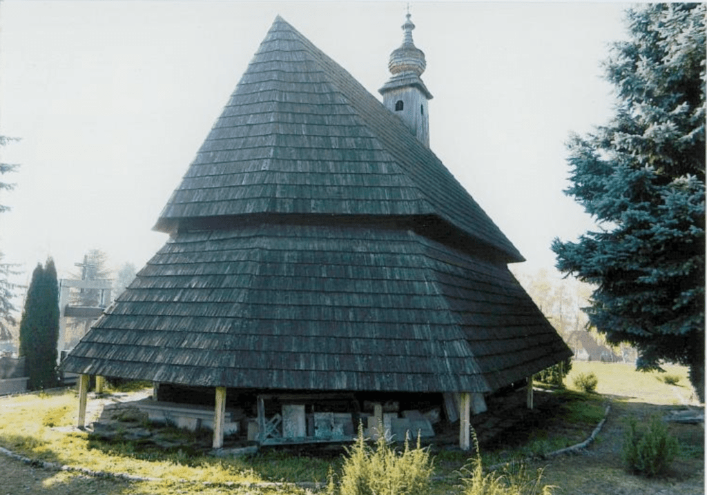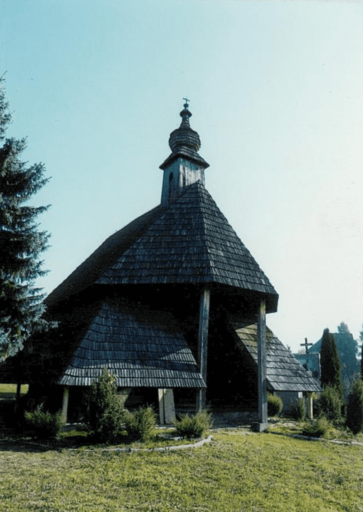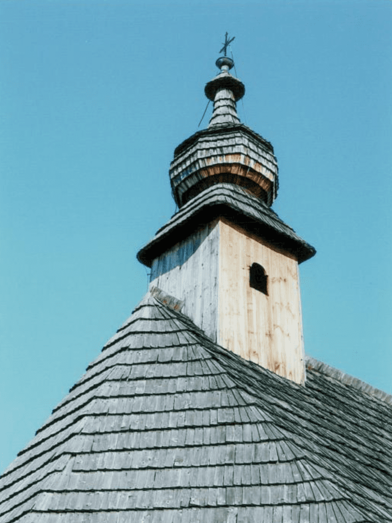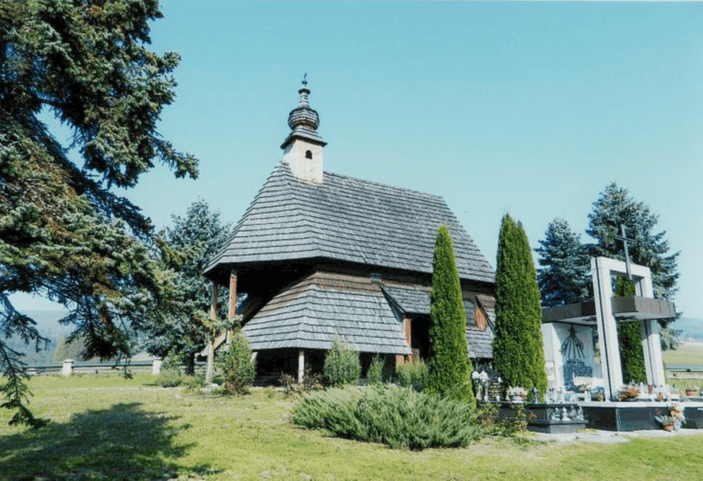 Charakterystycznym elementem architektonicznym są wydatne soboty, odtworzone przy bocznych ścianach nawy. Posiadają one daszki pulpitowe, wspierane na konstrukcji słupowej i kryte tradycyjnym gontem, co podkreśla regionalny charakter obiektu.