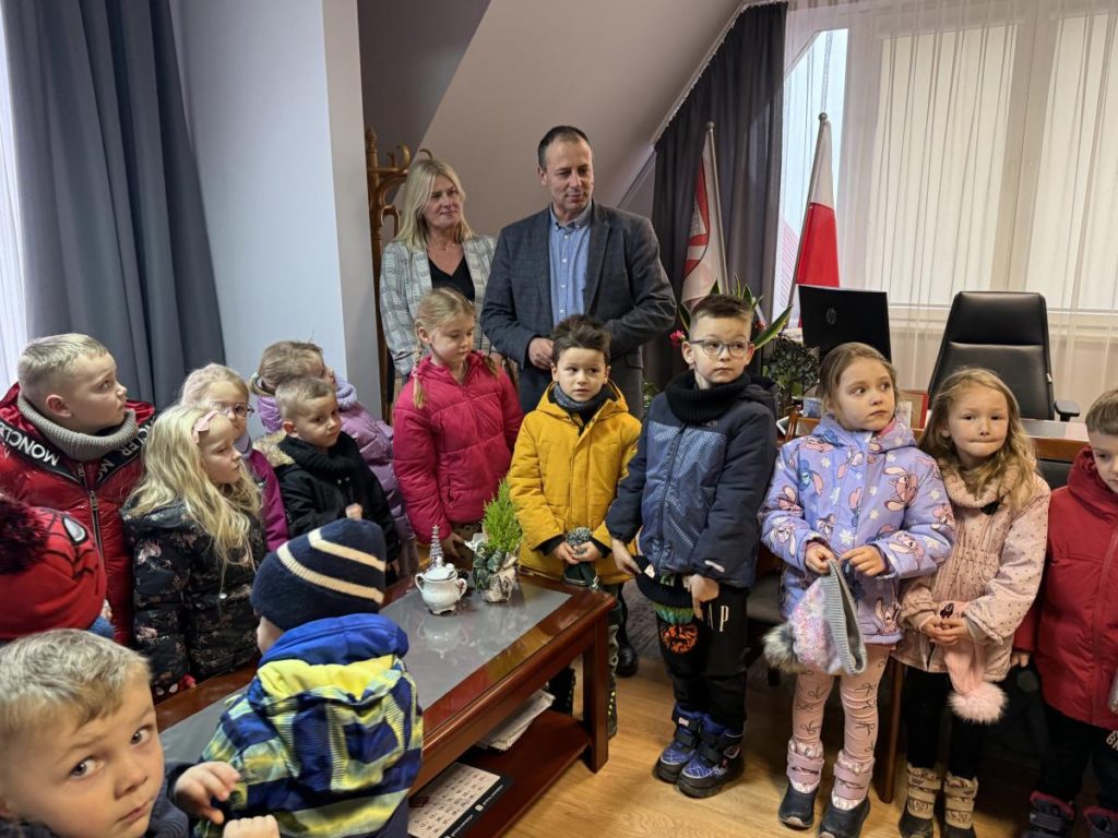 Przedstawiciele Urzędu podziękowali również przedszkolakom oraz ich wychowawczyniom za piękny występ i upominki. Dzieci nie zapomniały także o Pani Wójt – mimo jej dzisiejszej nieobecności, drobny upominek został pozostawiony na jej biurku.