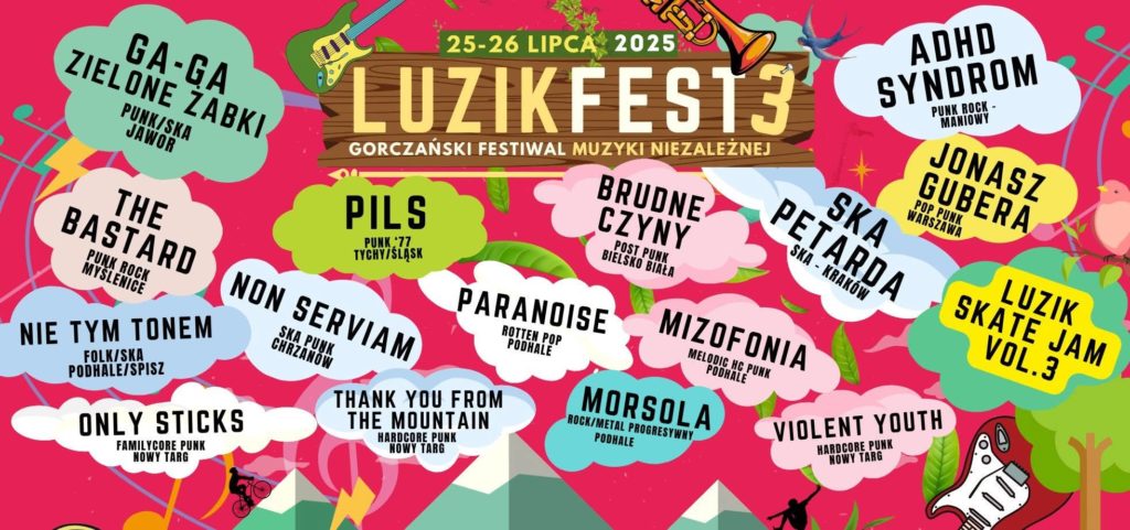 Już po raz trzeci w sercu Gorców zagości Luzik Fest – wyjątkowy festiwal muzyki niezależnej, który na dobre wpisał się w kulturalny krajobraz regionu. Tegoroczna edycja, jak zawsze, postawi na autentyczność, energię i lokalny klimat. Przez dwa dni scena Luzika będzie należeć do młodych, niezależnych zespołów z Gorców, Pienin i Podhala, które pokażą, że alternatywa ma się tutaj doskonale!